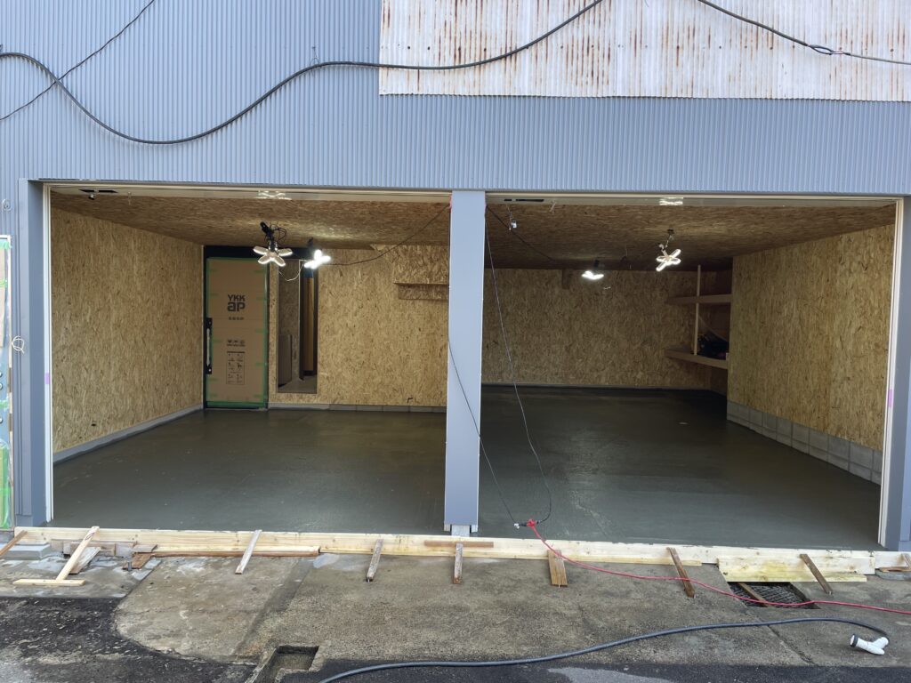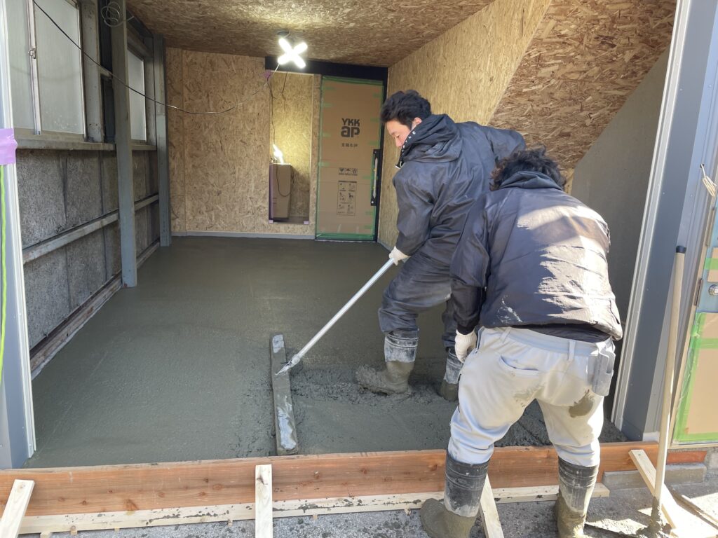 1月も終わりに近づいたある日。朝からのべ9台の生コン車がやってきて、1階の各スペースにコンクリートを流し込みました。そのあと、職人さんの手で気泡が抜かれ、丁寧にならされてゆきます。寒いので乾くのには相当の時間がかかるそうです。でも、途端に部屋らしくなりましたね。